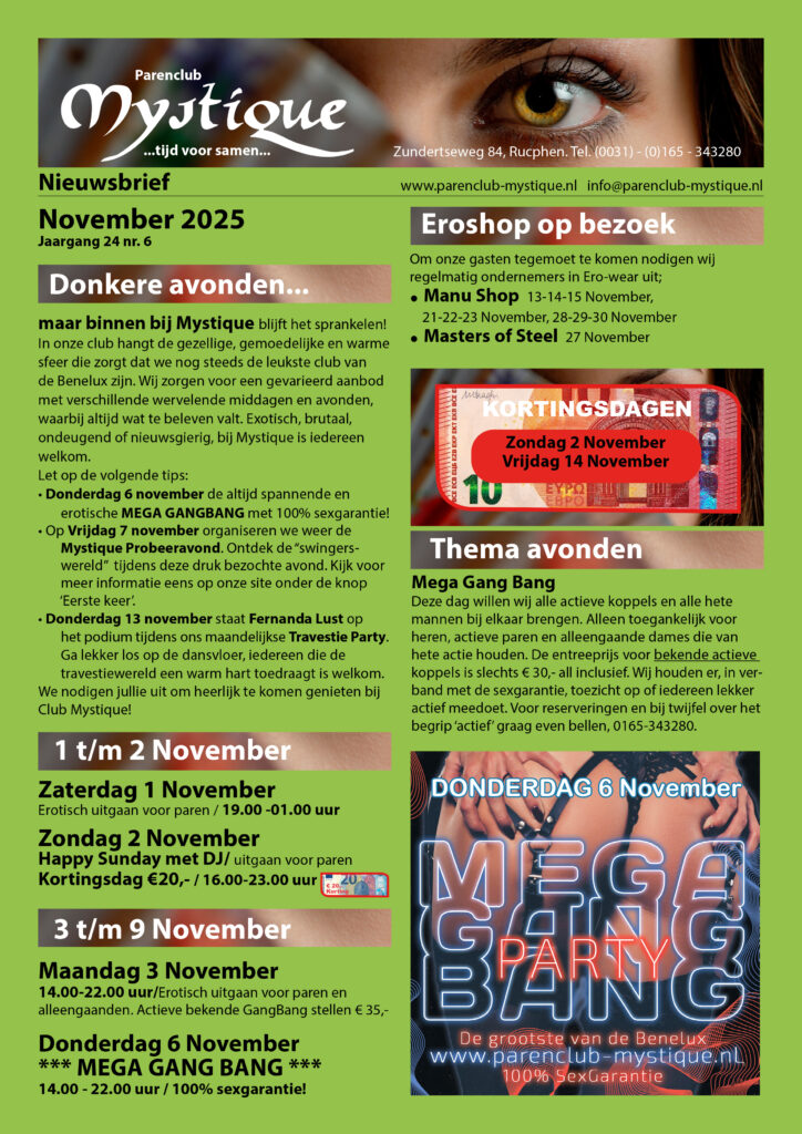 Bij Parenclub Mystique gaan we weer volledig los. Check daarom de beide pagina’s met activiteiten. De tijden en prijzen staan er ook bij, maar voor de meest actuele informatie is het altijd handig deze site in de gaten te houden. Wanneer zien we jullie?