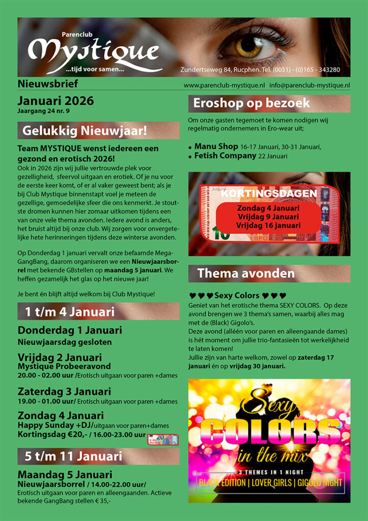 Bij Parenclub Mystique gaan we weer volledig los. Check daarom de beide pagina’s met activiteiten. De tijden en prijzen staan er ook bij, maar voor de meest actuele informatie is het altijd handig deze site in de gaten te houden. Wanneer zien we jullie?