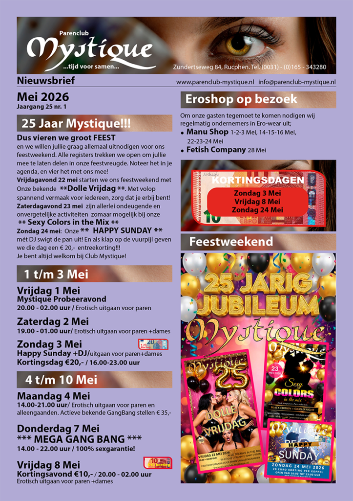 Bij Parenclub Mystique gaan we weer volledig los. Check daarom de beide pagina’s met activiteiten. De tijden en prijzen staan er ook bij, maar voor de meest actuele informatie is het altijd handig deze site in de gaten te houden. Wanneer zien we jullie?