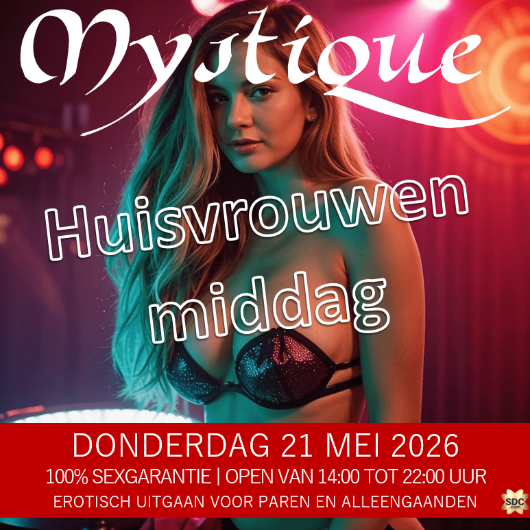 Je kunt het ze natuurlijk niet kwalijk nemen. De hele week werken ze enorm hard in het huishouden tot man lief thuis komt en alleen maar kan vragen: “Wat eten we?!”. En als de huisvrouw klaar is, wie bepaalt er dan wat er gekeken wordt?? Op deze dag neemt de hete Huisvrouw het over, zij zijn in full control. Wij mannen, wij hebben maar 1 taak, geven wat ze vragen. We gokken dat ze om sex vragen. 100% sex gegarandeerd tijdens deze middag bij Parenclub Mystique te Rucphen. Bijwonen? 14.00u tot 22.00u
