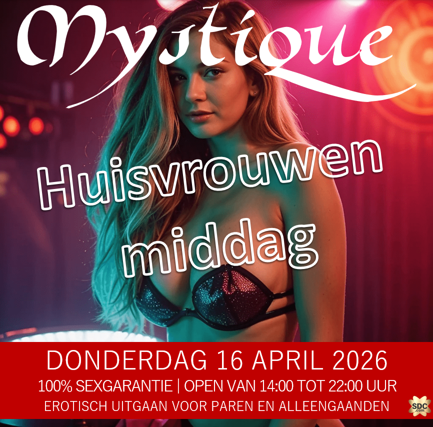 Je kunt het ze natuurlijk niet kwalijk nemen. De hele week werken ze enorm hard in het huishouden tot man lief thuis komt en alleen maar kan vragen: “Wat eten we?!”. En als de huisvrouw klaar is, wie bepaalt er dan wat er gekeken wordt?? Op deze dag neemt de hete Huisvrouw het over, zij zijn in full control. Wij mannen, wij hebben maar 1 taak, geven wat ze vragen. We gokken dat ze om sex vragen. 100% sex gegarandeerd tijdens deze middag bij Parenclub Mystique te Rucphen. Bijwonen? 14.00u tot 22.00u